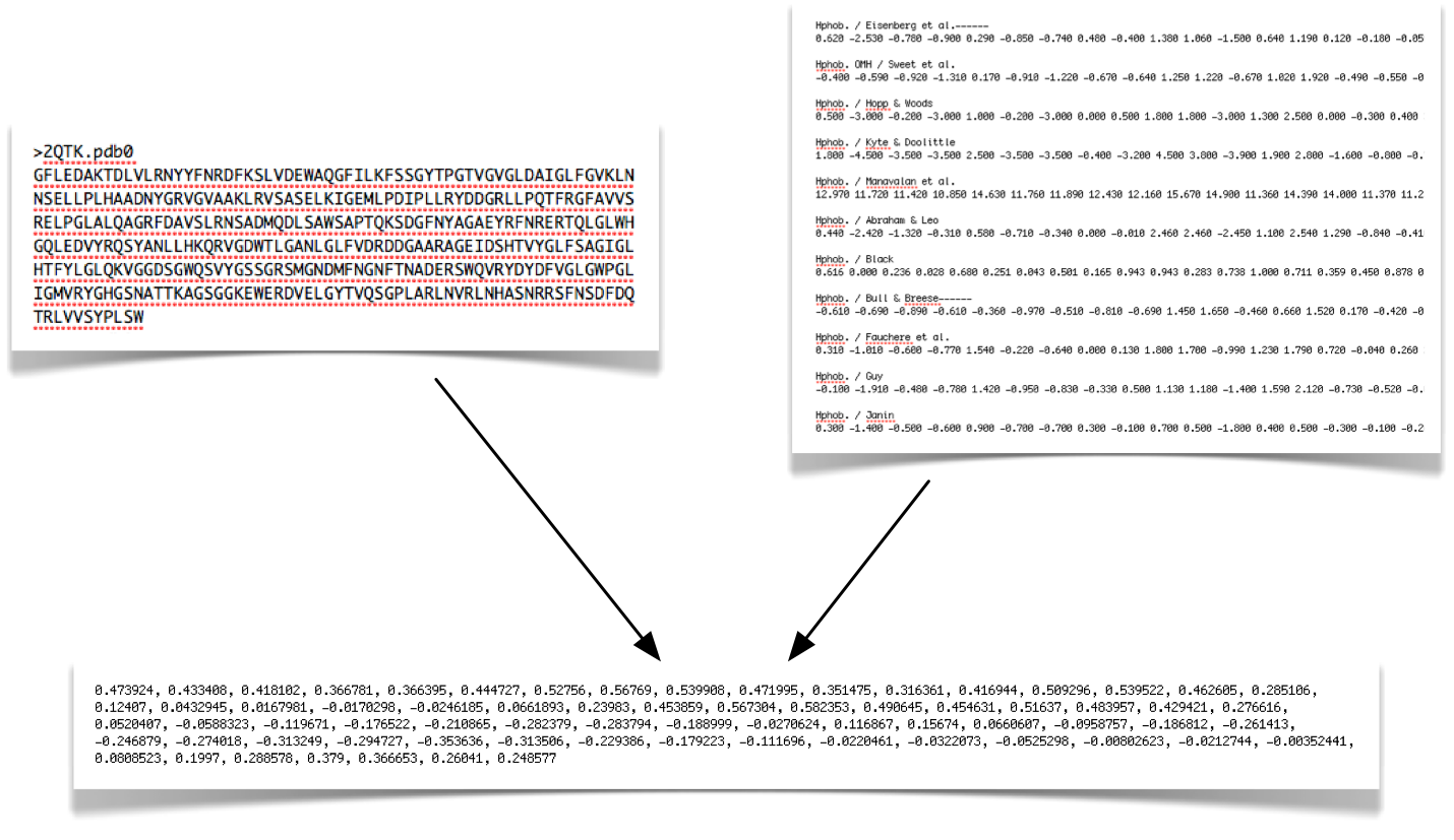 The very first step of algorithm operation is information extraction from protein sequences. A number of experimental scales (shown top right) are applied to individual protein sequences. Each amino acid (AA) in the sequence is then scored and turned into a profile: