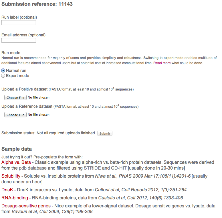 Here an updated list of examples is provided. This can be used to try out the tool without the need to have any datasets ready. A single click to a dataset of the user's choice pre-fills all the field required for successful submission.