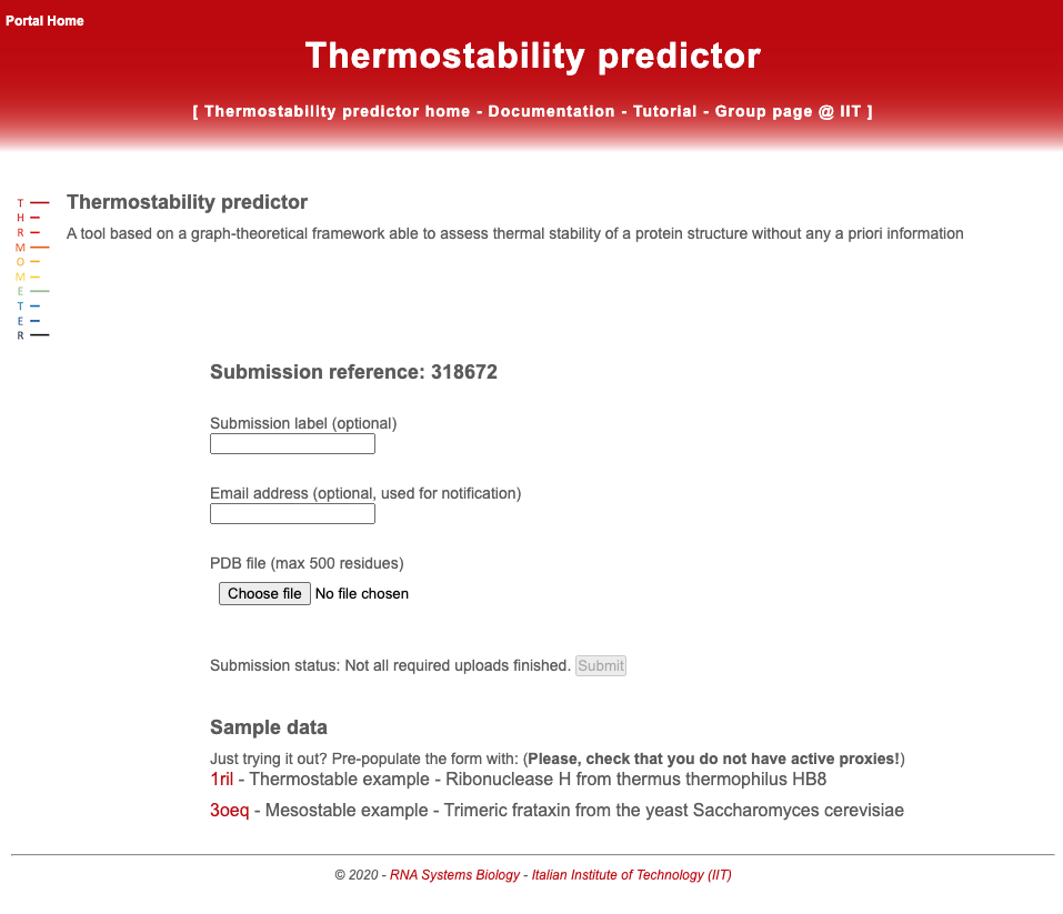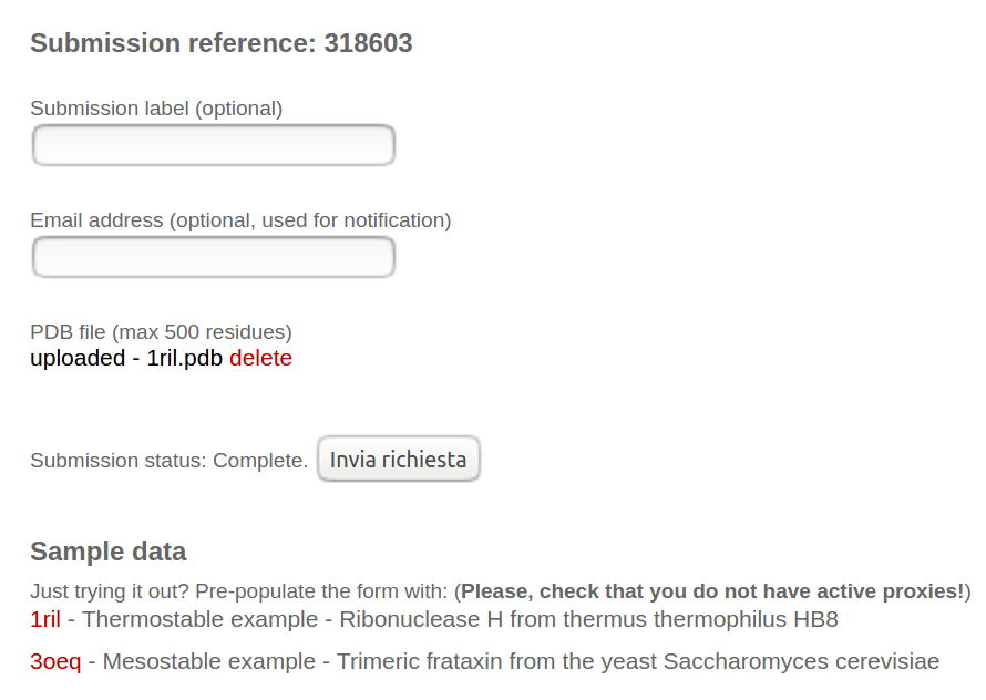 As sample data, we provided one case of a thermostable protein (PDB id: 1ril) and one mesostable (PDB id: 3oeq). By clicking on the PDB id (in red), the example is loaded in the input boxes. The user can optionally insert a valid email address to receive the results.