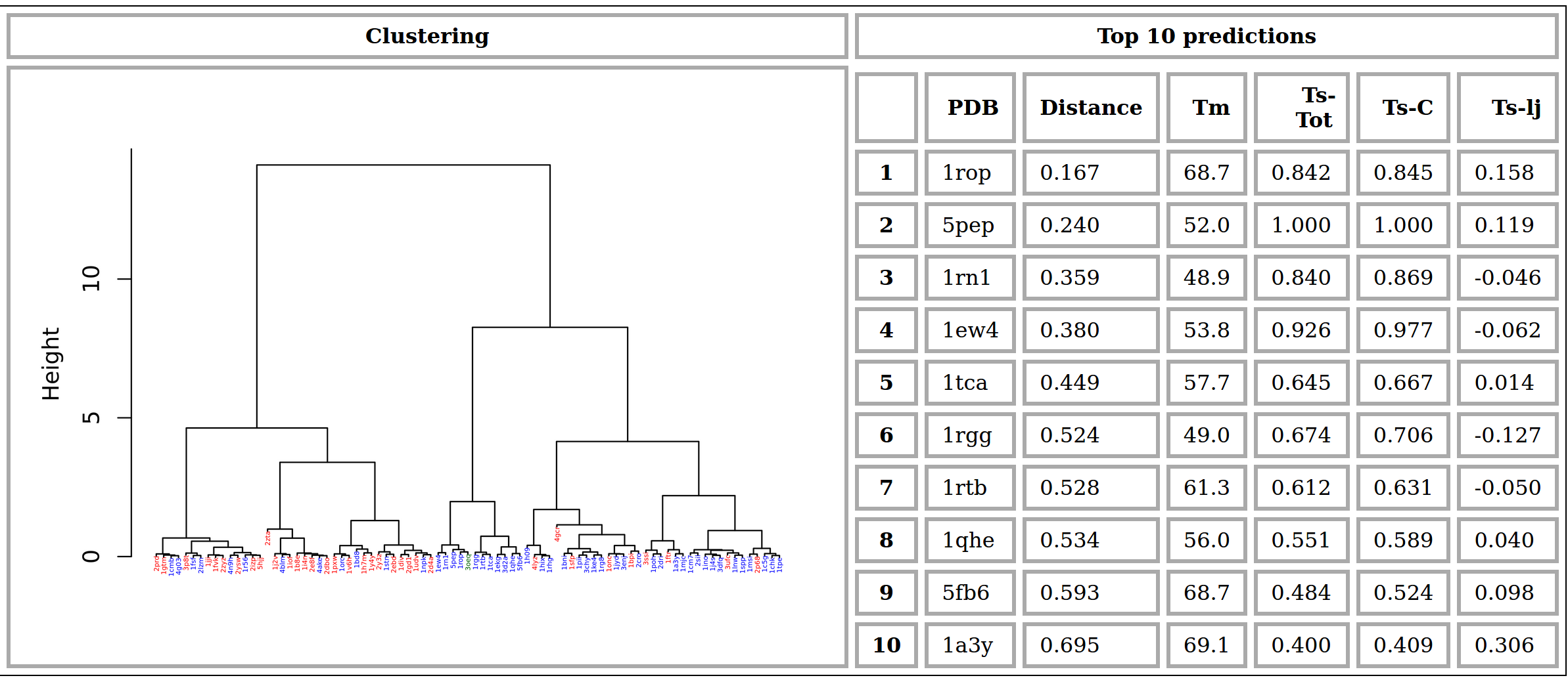 The results of the clustering analysis on the 84 proteins with experimentally known melting temperature and the submitted one are reported. For each protein, three different scores are used to cluster proteins, i.e the total energy and specific interaction terms of Coulomb and LJ interactions. On the left side, it is shown the hierarchical clustering using the Ward method as linkage function and the Euclidean distance among the three descriptors as distance metric. Proteins with Tm higher than 70 °C are colored in red, those with melting temperature lower than 70 °C are colored in blue, while the submitted protein is marked in green. On the right, the top 10 proteins of the original dataset, found closest to the submitted one in the simulative run, are reported. For each protein, one can find the PDB code, its distance from the submitted protein, the melting temperature and the three normalized Ts scores used for the clustering. The complete table is made available in the zip file that the user can download. Note that as the randomization procedure (see Documentation) is stochastic, some variability is present among different repetitions of the same run, which depends on the features of the associated RIN network.